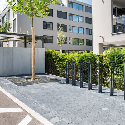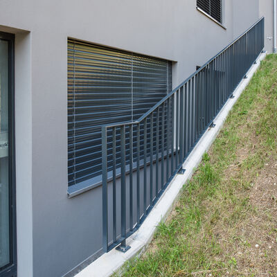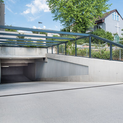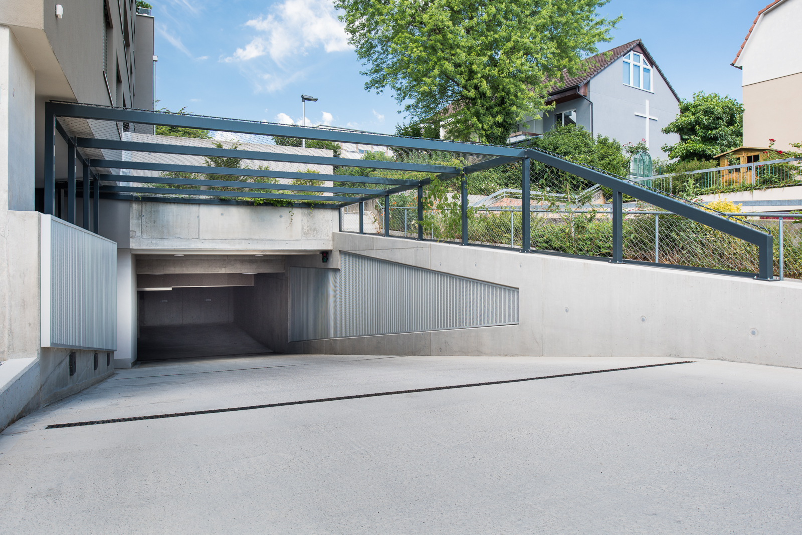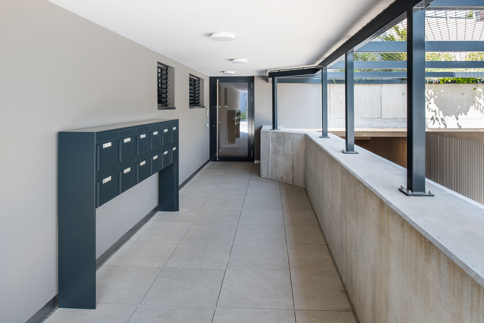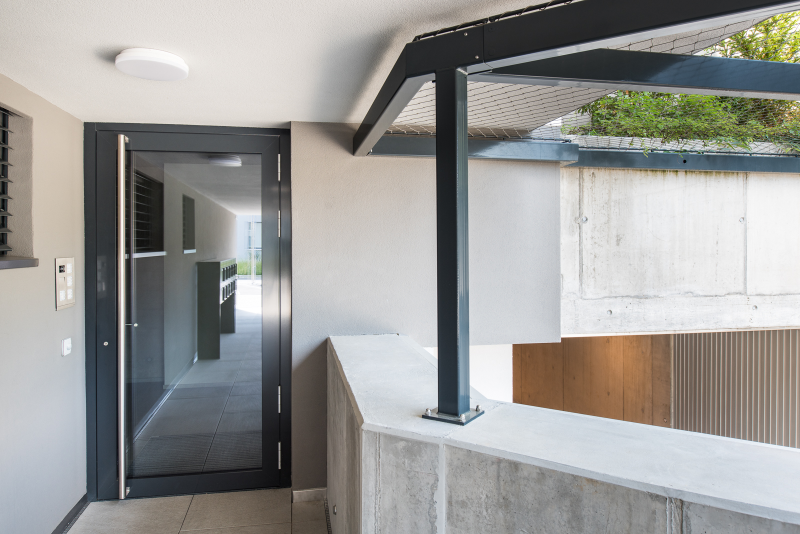 Somit durfte die Ankli Metallbau AG für die Häuser A-E jeweils Handläufe aus Chromnickelstahlrohr für das Treppenhaus, Staketengeländer, Ganzglasgeländer für die Terrassen und die Attikas sowie jeweils die Eingangspartien aus Türen und Briefkästenanlagen ausführen. Die Ganzglasgeländer, welche aus VSG Braunglas bestehen, wurden auf Verkleidungsbleche aus Chromnickelstahl montiert und sorgen für eine gewisse Transparenz der Sichtbarkeit. Ausserdem wurde bei allen Tiefgarageneinfahrten ein Unterstand aus Stahlrohr mit integriertem Geländer mit Webnetfüllung Typ Jakob realisiert. Alle Stahlteile wurden feuerverzinkt und in der entsprechenden Wunsch-RAL-Farbe pulverbeschichtet.