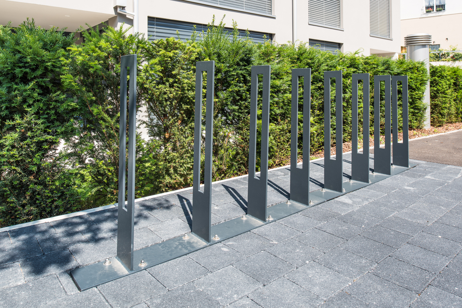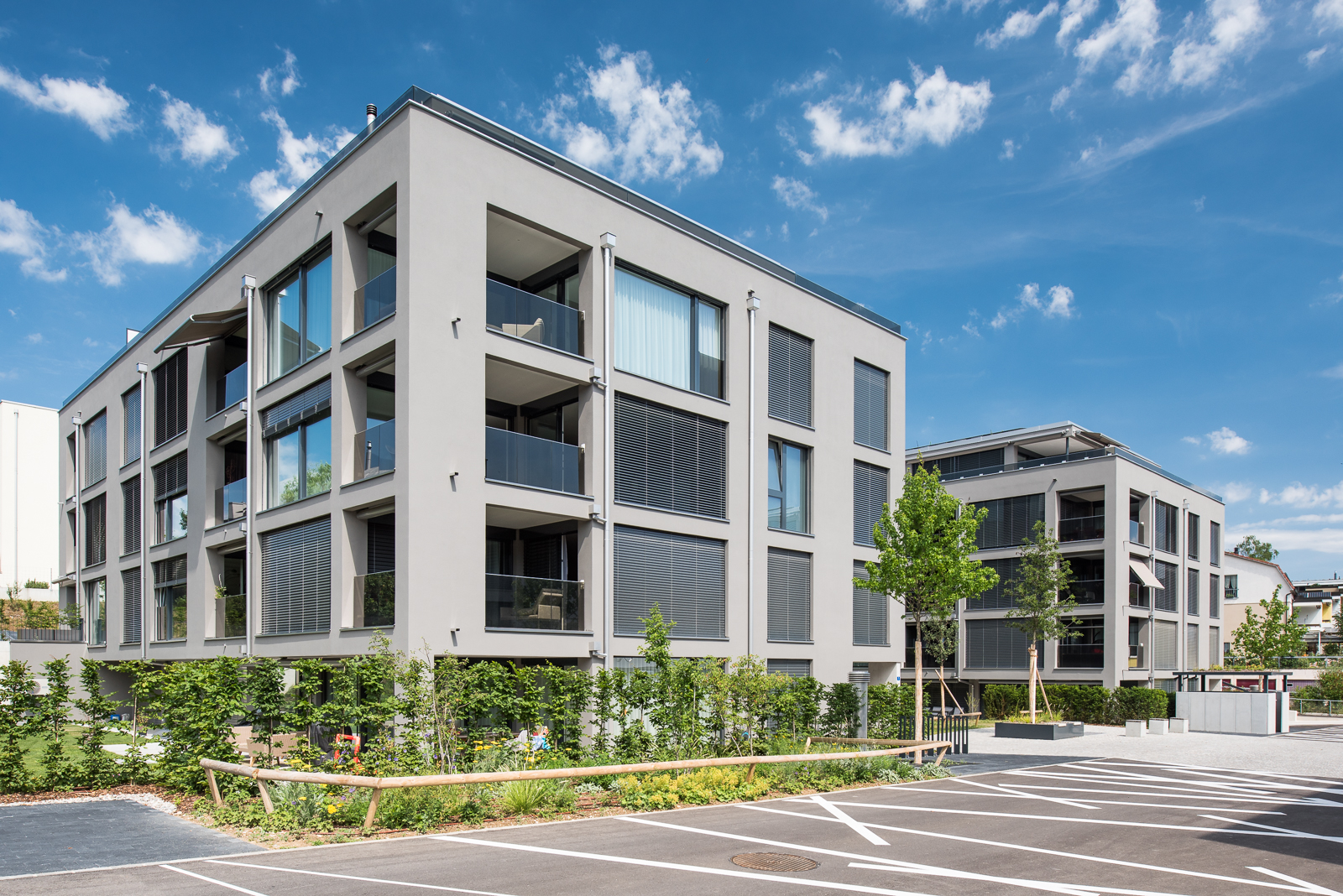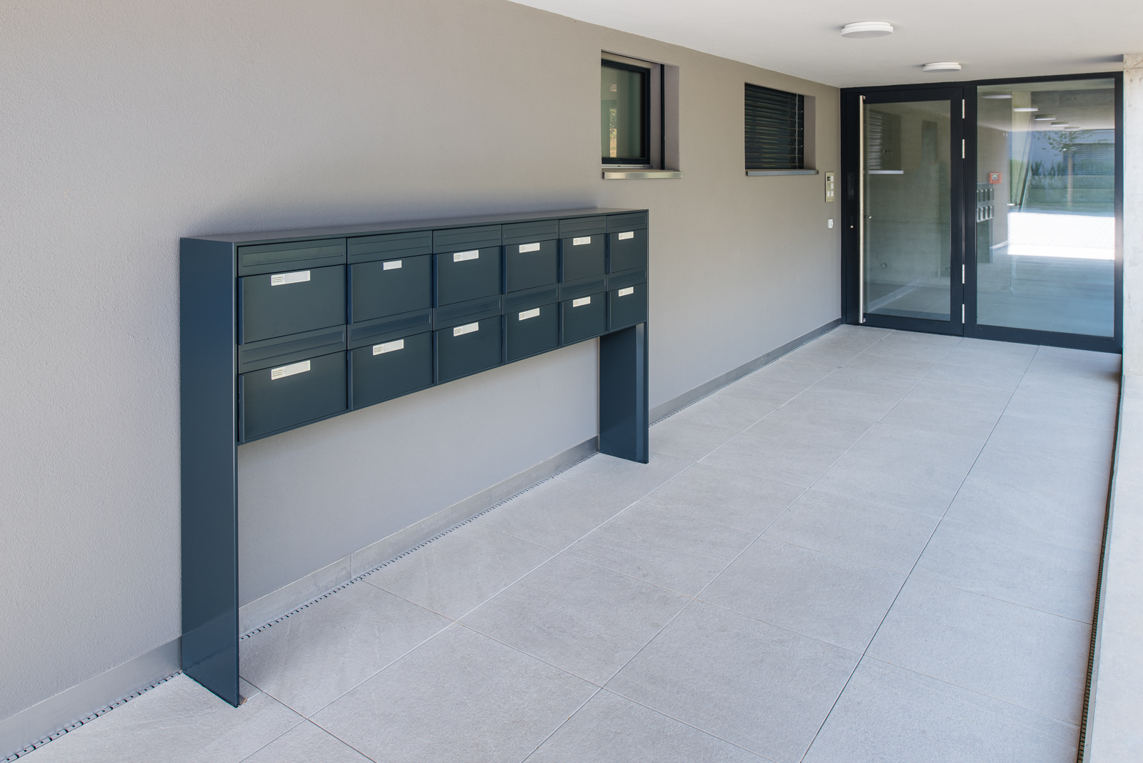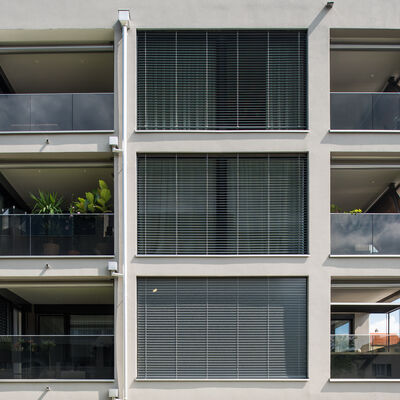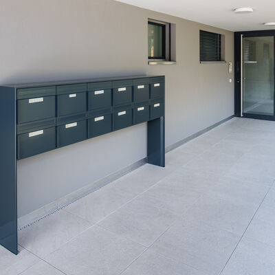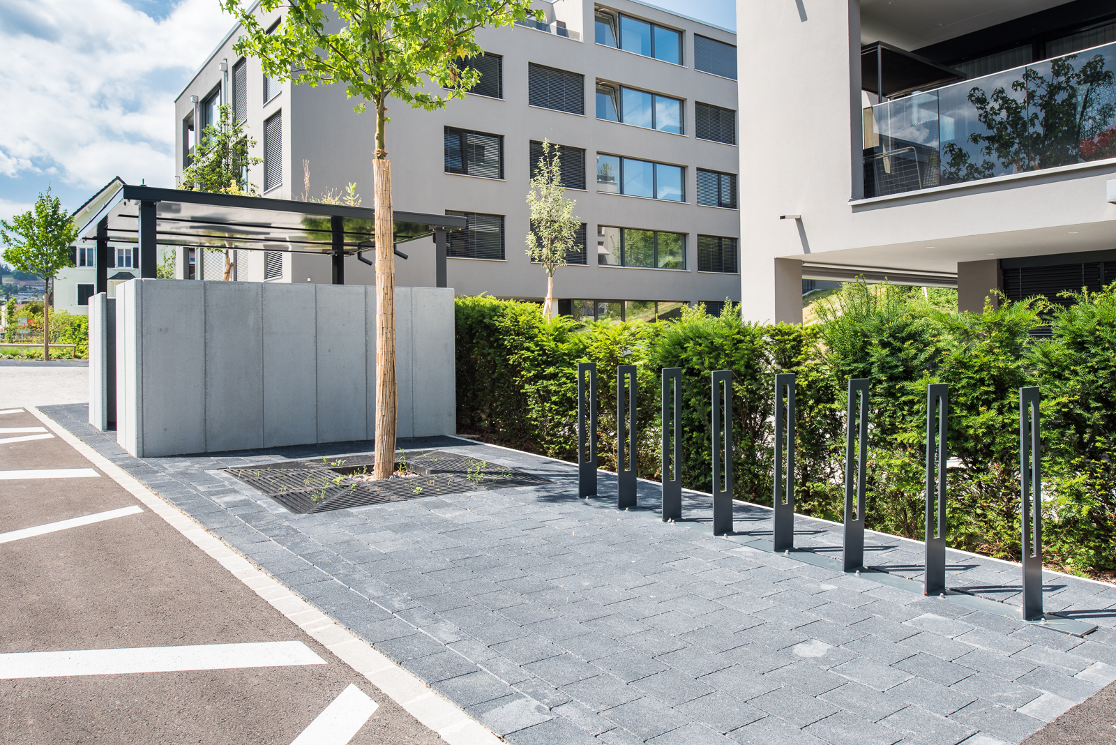 Somit durfte die Ankli Metallbau AG für die Häuser A-E jeweils Handläufe aus Chromnickelstahlrohr für das Treppenhaus, Staketengeländer, Ganzglasgeländer für die Terrassen und die Attikas sowie jeweils die Eingangspartien aus Türen und Briefkästenanlagen ausführen. Die Ganzglasgeländer, welche aus VSG Braunglas bestehen, wurden auf Verkleidungsbleche aus Chromnickelstahl montiert und sorgen für eine gewisse Transparenz der Sichtbarkeit. Ausserdem wurde bei allen Tiefgarageneinfahrten ein Unterstand aus Stahlrohr mit integriertem Geländer mit Webnetfüllung Typ Jakob realisiert. Alle Stahlteile wurden feuerverzinkt und in der entsprechenden Wunsch-RAL-Farbe pulverbeschichtet.