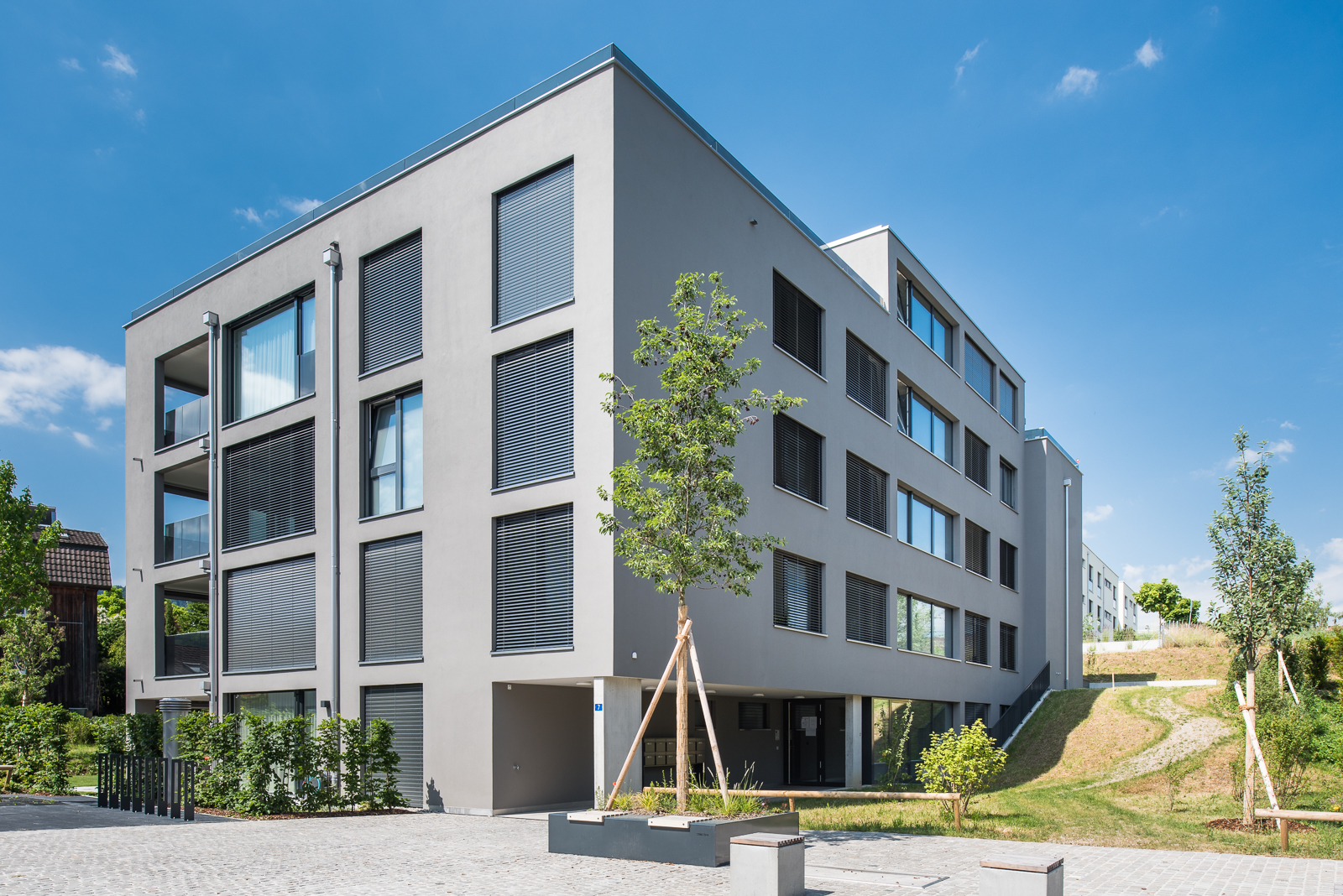 In Aesch wurde 2021 eine grosse Überbauung fertiggestellt. Die Ankli Metallbau AG bekam den Auftrag von der Projektleitung Immo Bau AG Nordwestschweiz, um bei den 5 ähnlichen Mehrfamilienhäuser die Metallbauarbeiten zu realisieren.