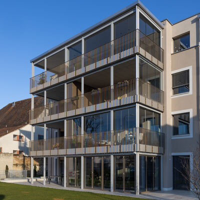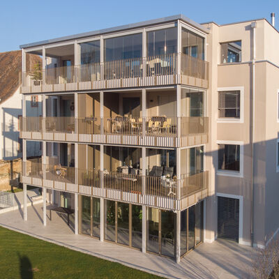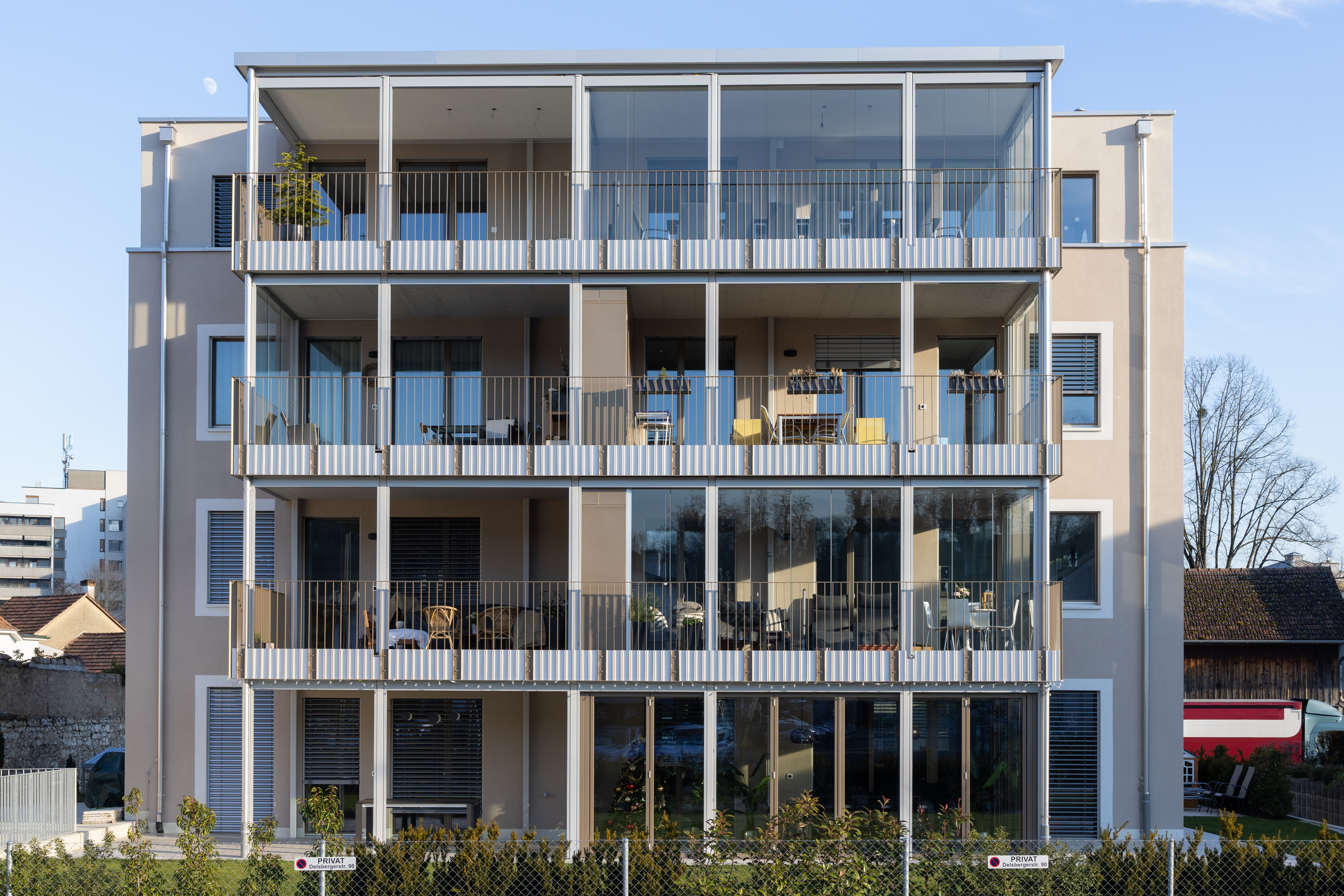 Die Eingangspartie und der Briefkasten wurden jeweils aus Aluminium in der gewünschten Farbe eloxiert. Im Weiteren sind die Balkongeländer aus Flachstahl feuerverzinkt und pulverbeschichtet stirnseitig an den Beton montiert. Zu guter Letzt wurden Wintergärten bei einzelnen Parteien / Eigentumswohnungen realisiert. Diese Verglasungen bieten einen idealen Schutz vor Witterungen und einen transparenten Durchblick, um trotzdem bei jedem Wetter auf den Balkon die Zeit und den Ausblick zu geniessen.