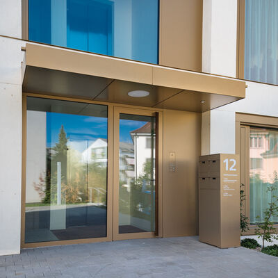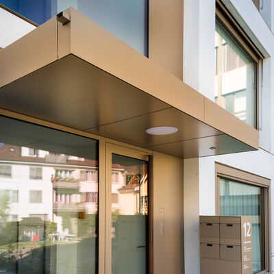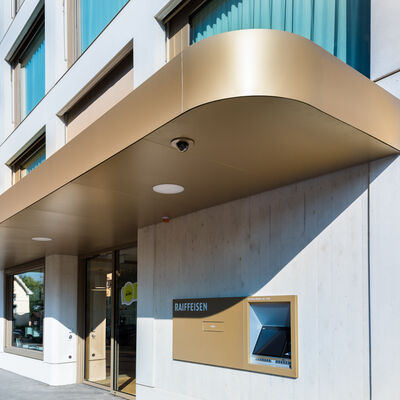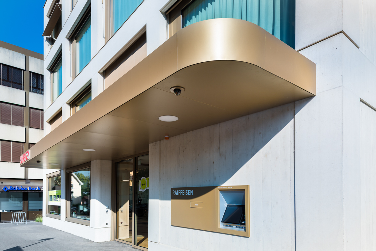 Die Schweizer Banken haben den Anspruch, gegenüber Ihren Kunden, absolut professionell, vertrauenswürdig und mit einem perfekten Erscheinungsbild zu punkten. Dieses Bestreben wurde ersichtlich als in Dornach eine neue Filiale der Raiffeisenbank gebaut wurde. Zusammen mit dem zuständigen Architekten durften wir die anspruchsvollen Metallbauarbeiten planen und produzieren. Das markante Vordach beim Haupteingang wurde vollumfänglich mit Aluminiumblech verkleidet. Es sollten keine Befestigungsmittel zu sehen sein. Die abgerundeten Ecken integrieren sich elegant in die sonst geradlinigen Konturen des Gebäudes. Die Aussengeländer erscheinen elegant und dennoch bieten Sie den nötigen Halt der wichtig für das Vertrauen in die Konstruktion ist.