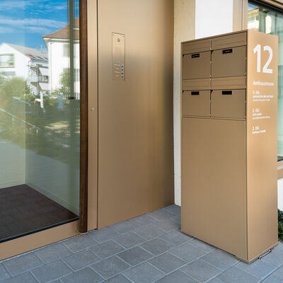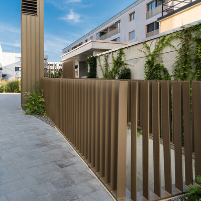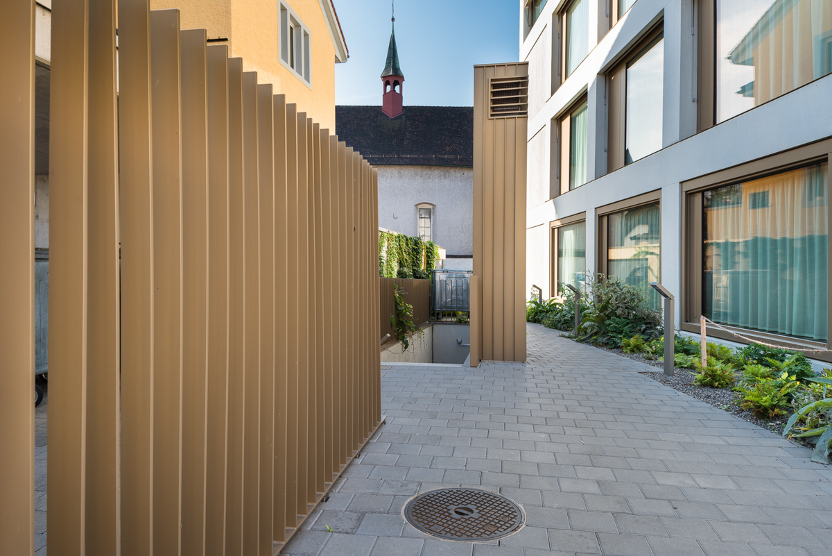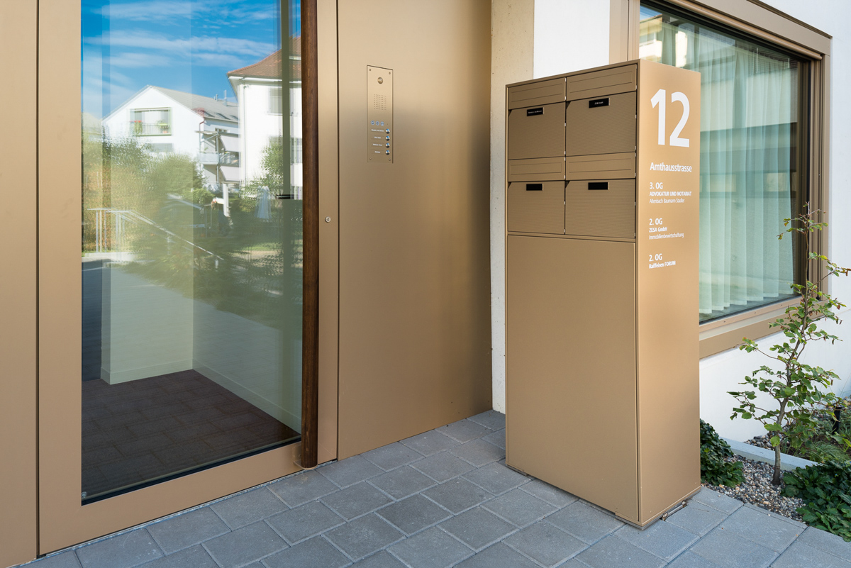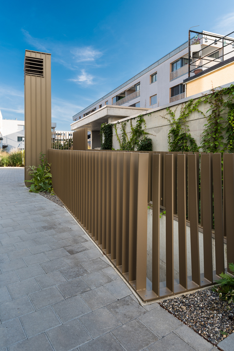 Selbst die Entlüftung der Tiefgarage welche normalerweise über ein langweiliges Stahlrohr erfolgt, wurde mit einem formschönen Kamin aus Stahl und mehrfach abgekantetem Aluminiumblech gefertigt. Die Konturen des Kamins harmonieren perfekt mit den restlichen Bauteilen. Die Briefkastenanlage sowie die Blechverkleidungen der Bankomaten runden das angestrebte Konzept in Bezug auf Farbe und Ästhetik als Ganzes ab.